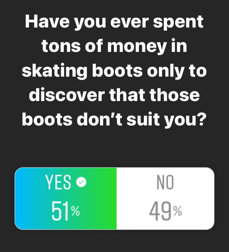 The second question was, “Have you ever spent tons of money in skating boots only to discover those boots don’t suit you?”, to which I got 51%, yes and 49% no. This result doesn’t necessarily mean that this issue is not important. There have been lots of skaters, including myself, that have spent their hard-earned money in order to get better boots and blades/frames, only to discover that they are the wrong size or fit.